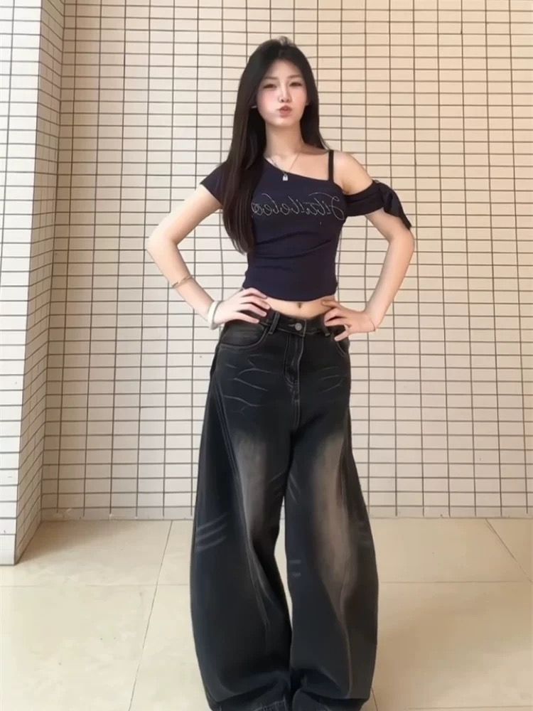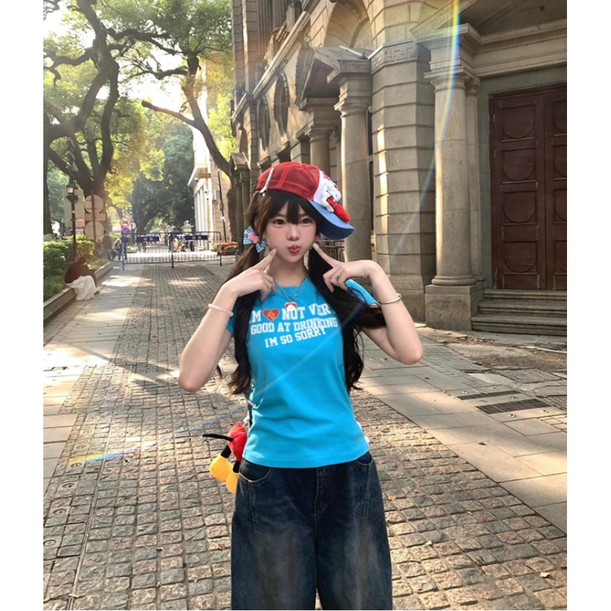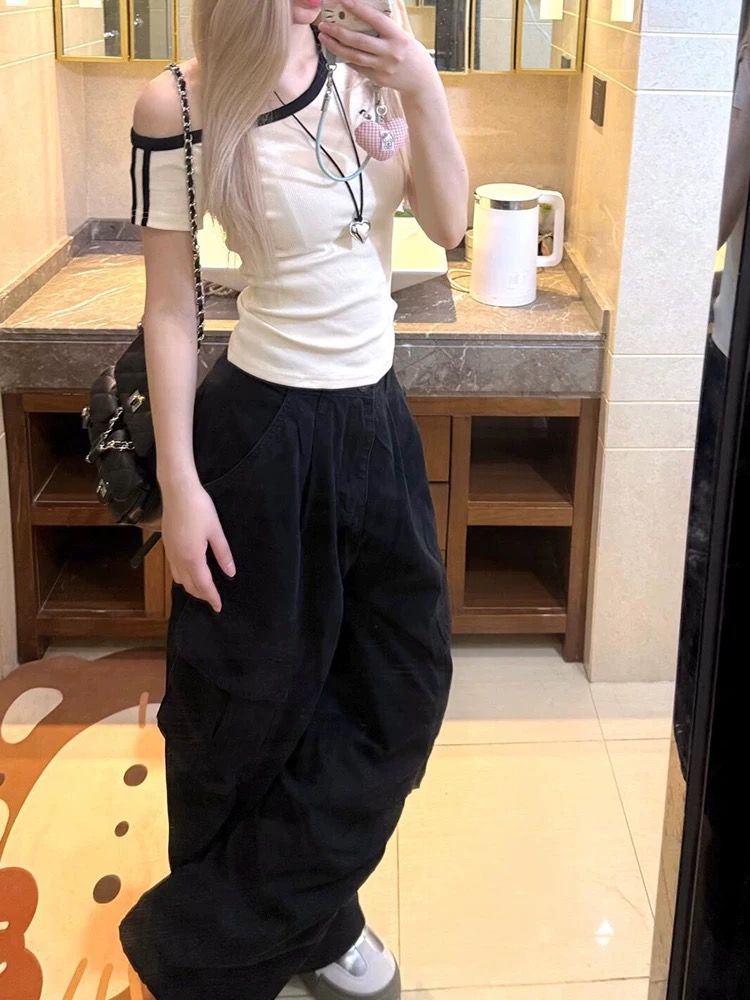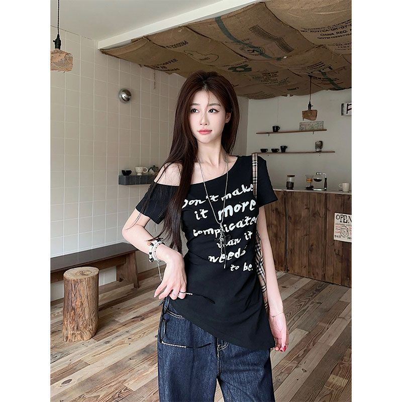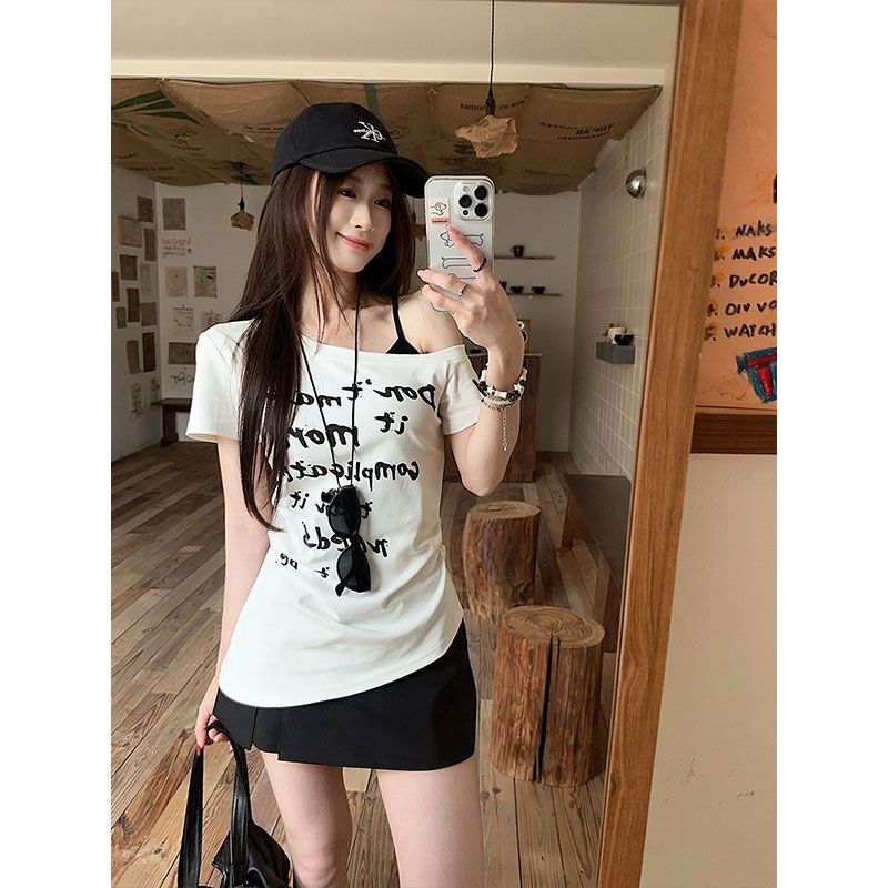 美式辣妹字母印花斜肩短袖T恤夏季收腰露肩上衣女