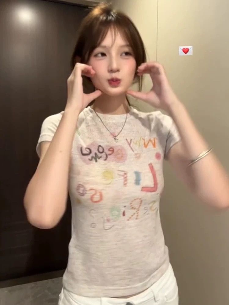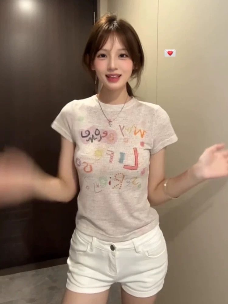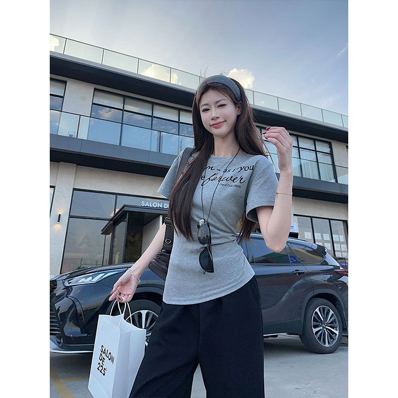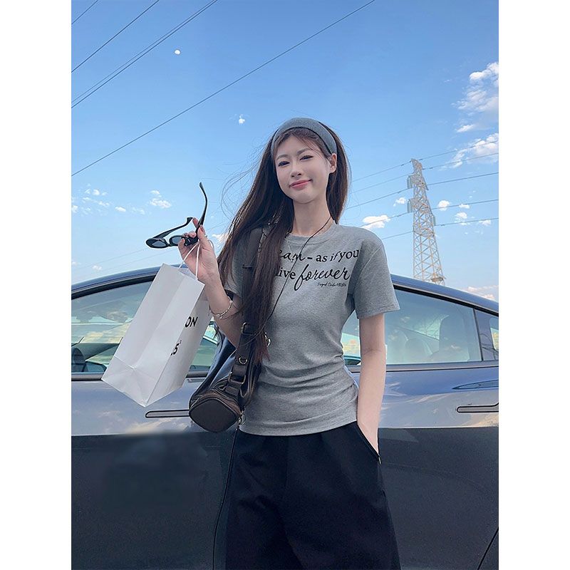 韩版收腰显瘦字母印花短袖T恤女夏季百搭绝美正肩短款上衣