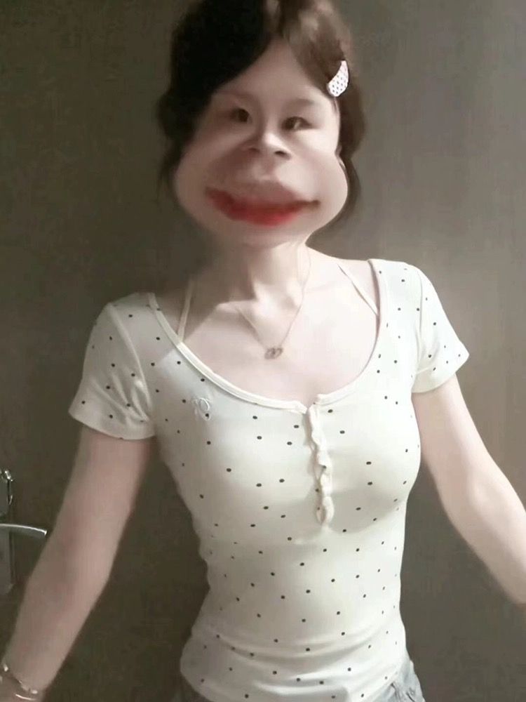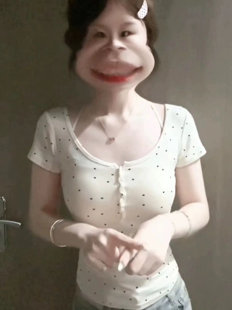 纽扣半开领短袖波点紧身上衣 绣花