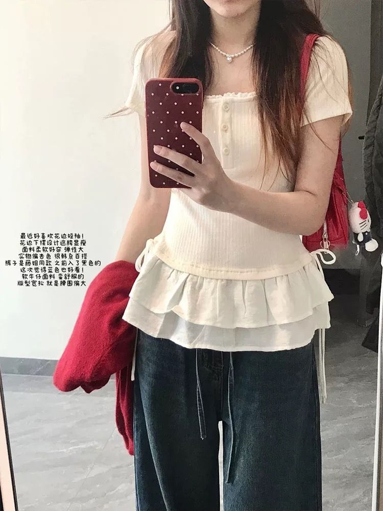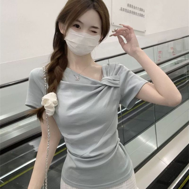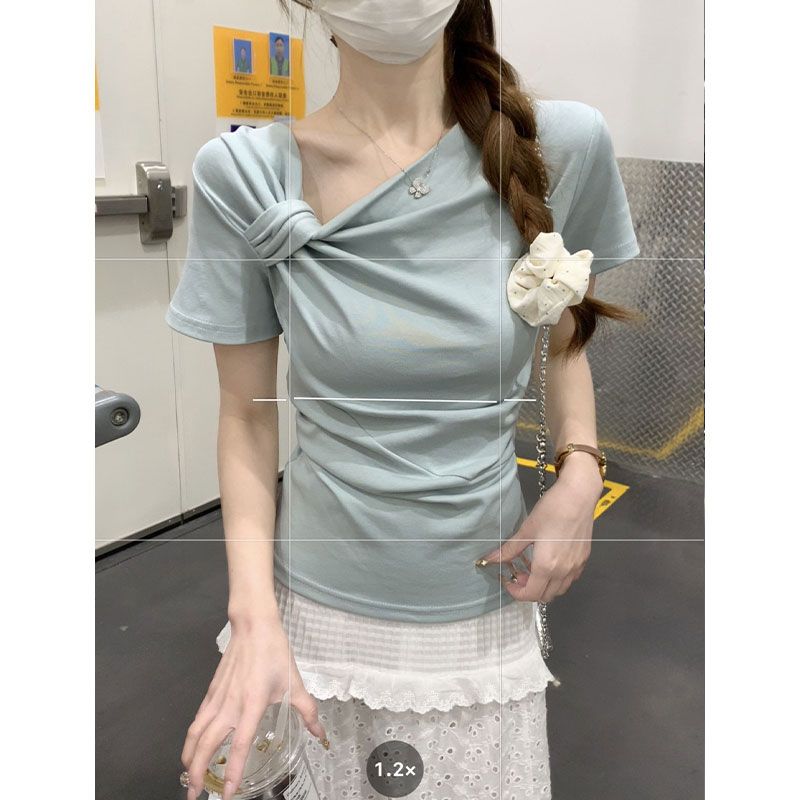 甜美风短袖T恤女装春季白色纽结设计不规则时尚显瘦褶皱上衣