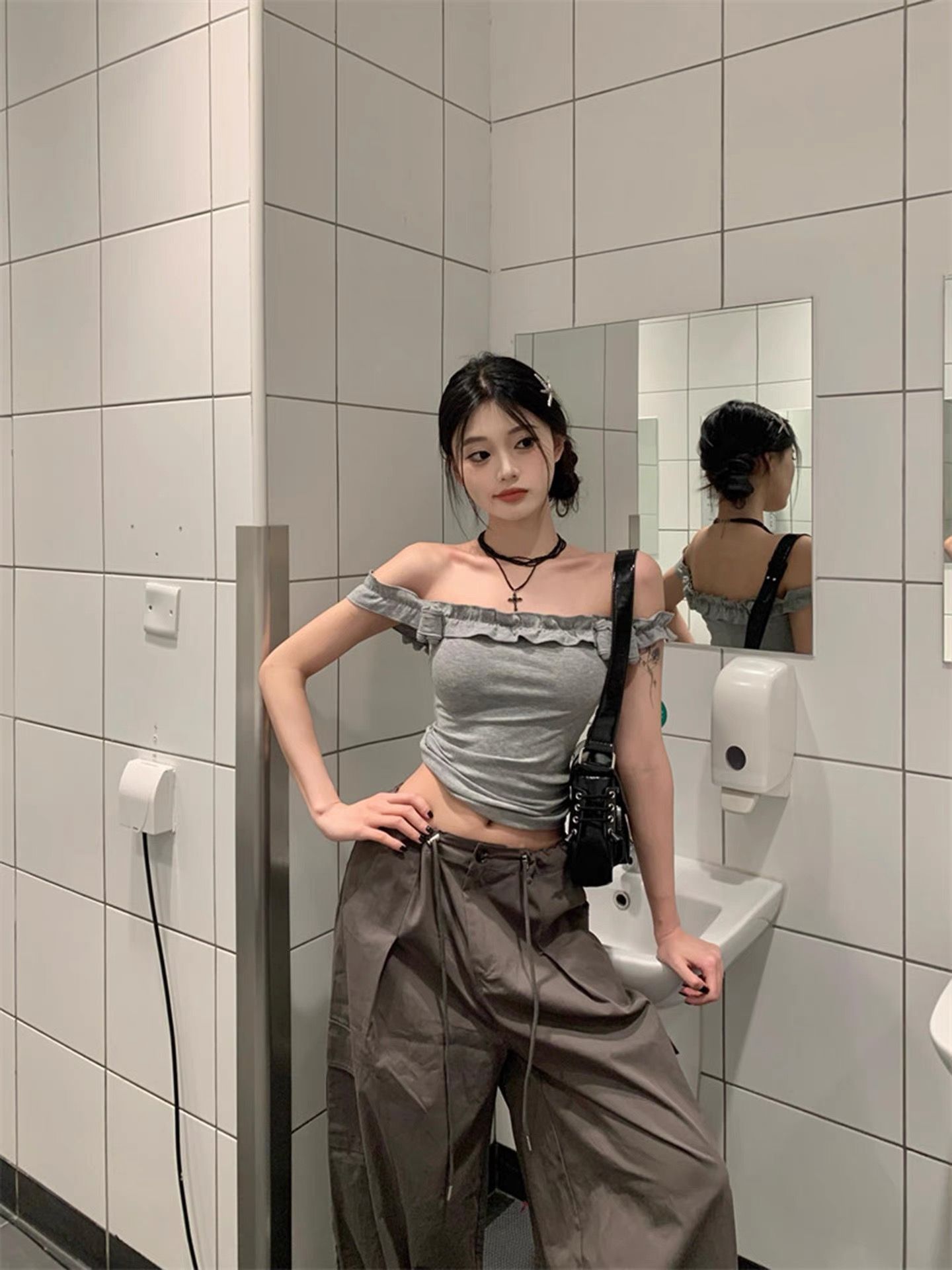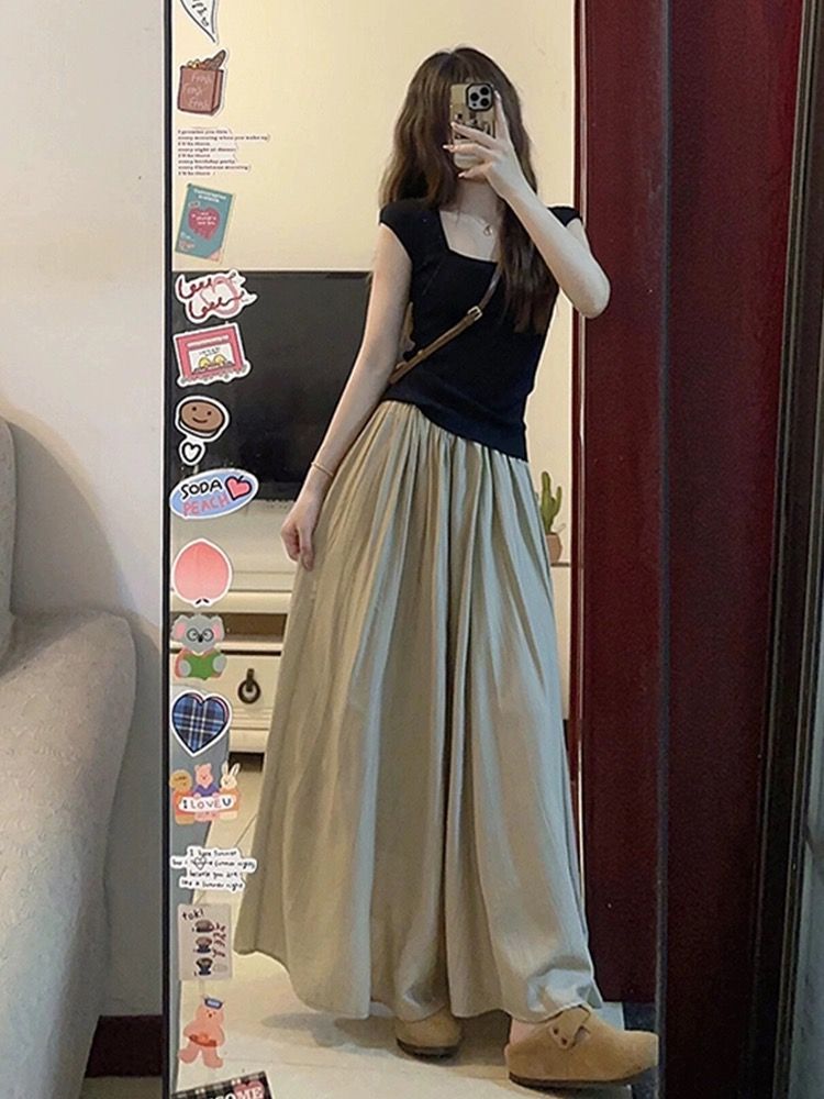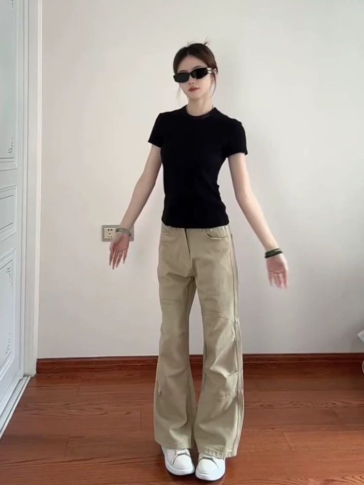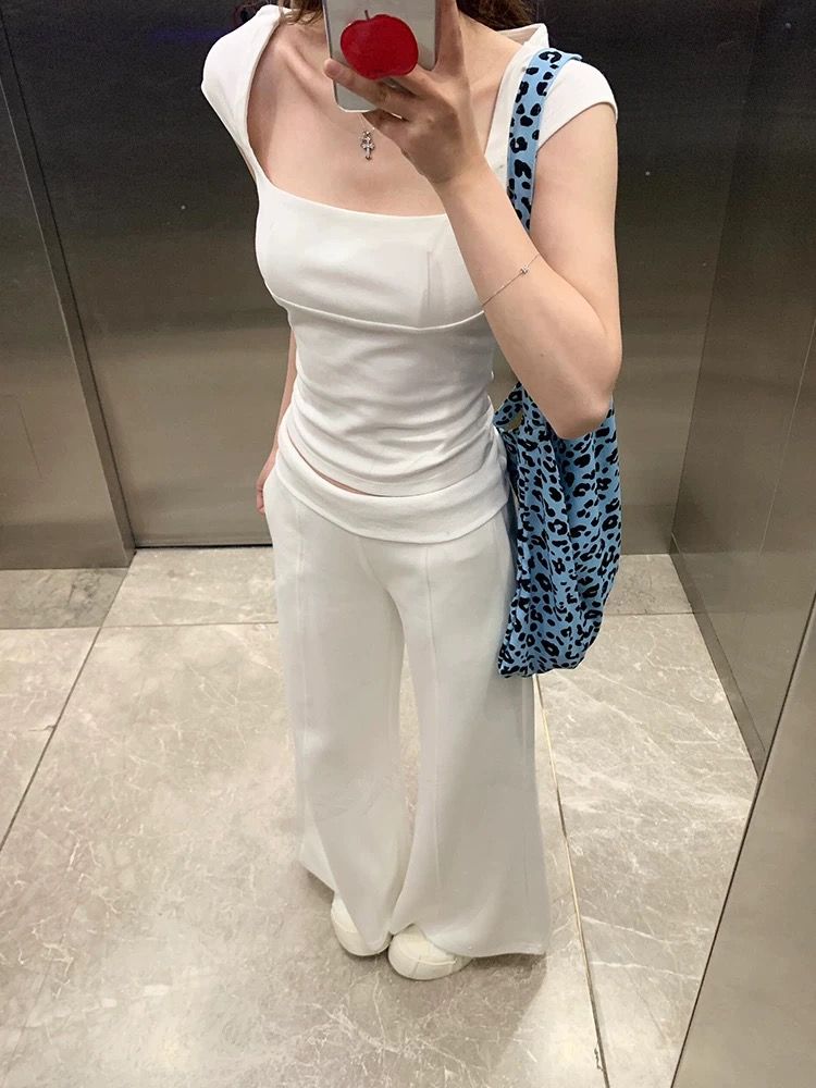 掐腰方领黑色短袖新款爆款设计感上衣
