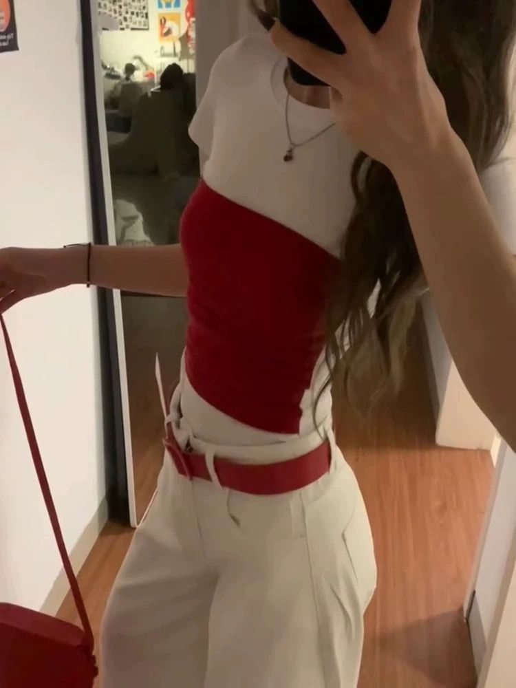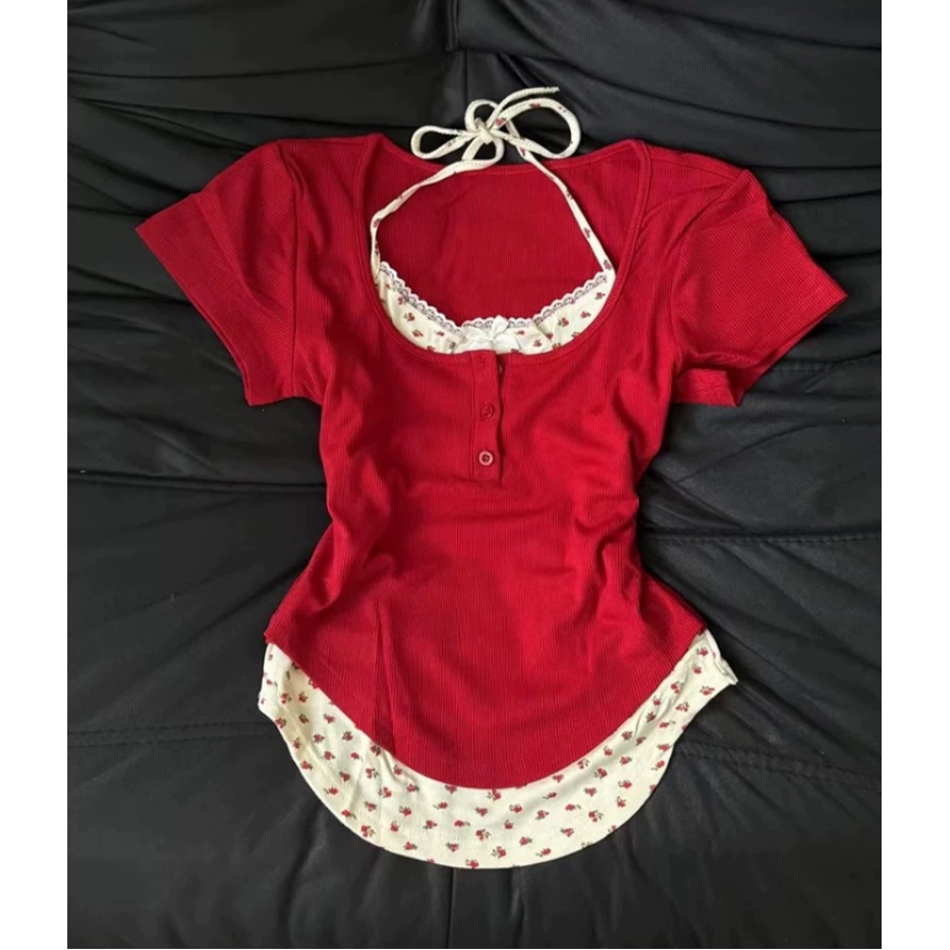 T恤修身短袖, 假两件 上衣