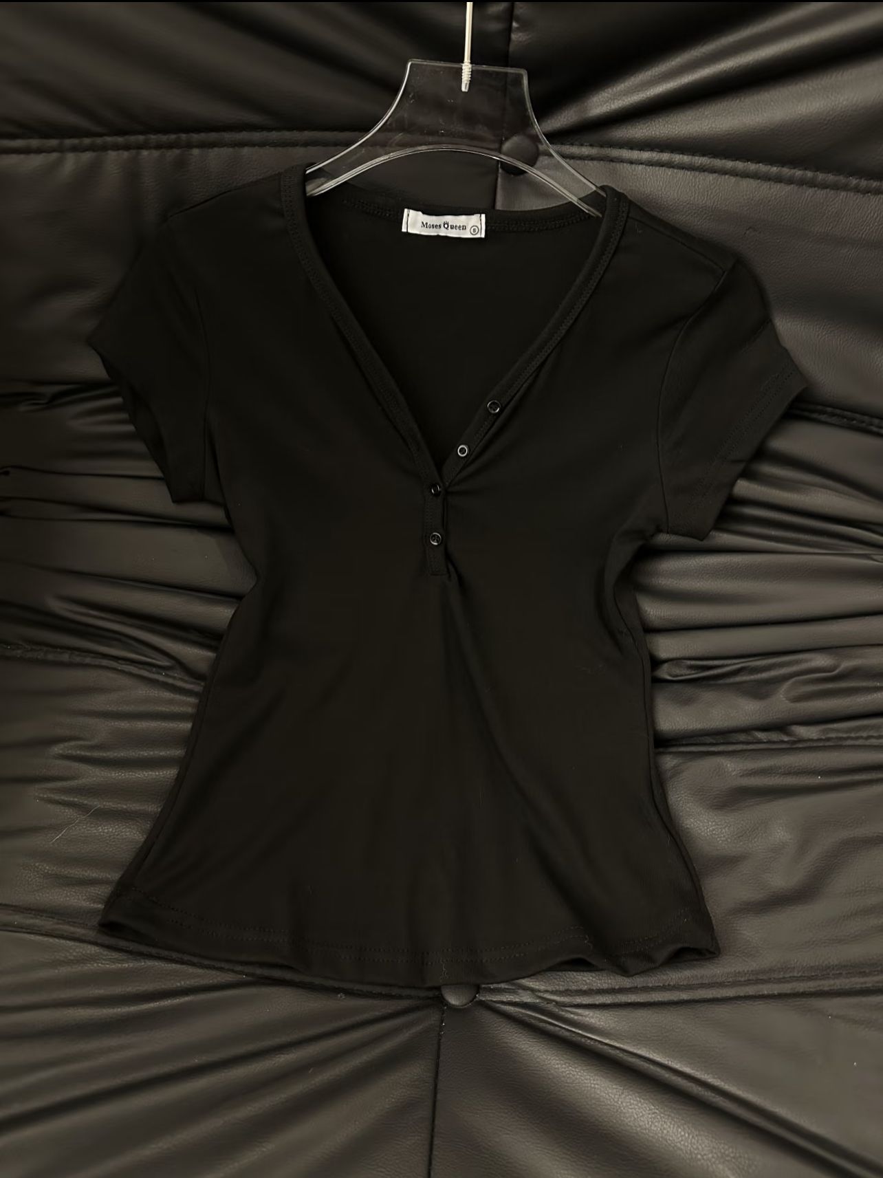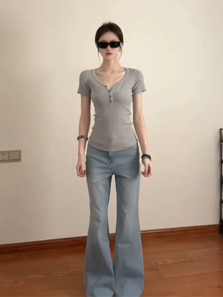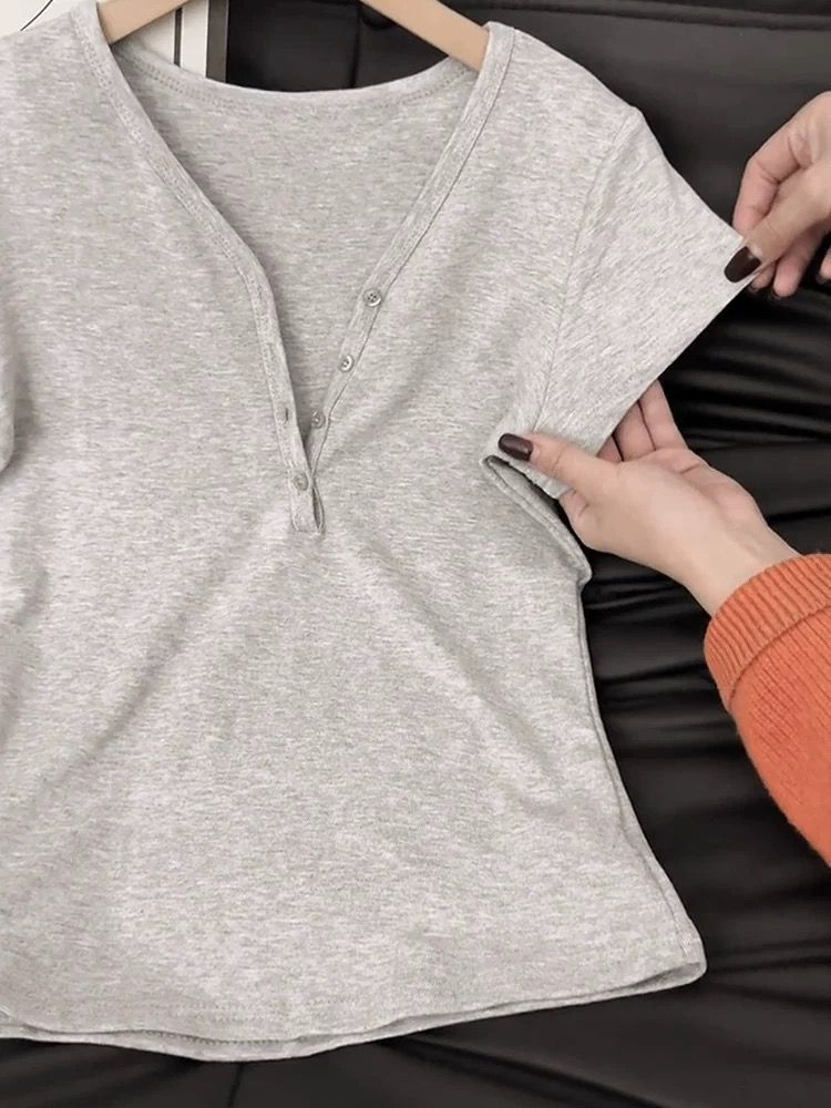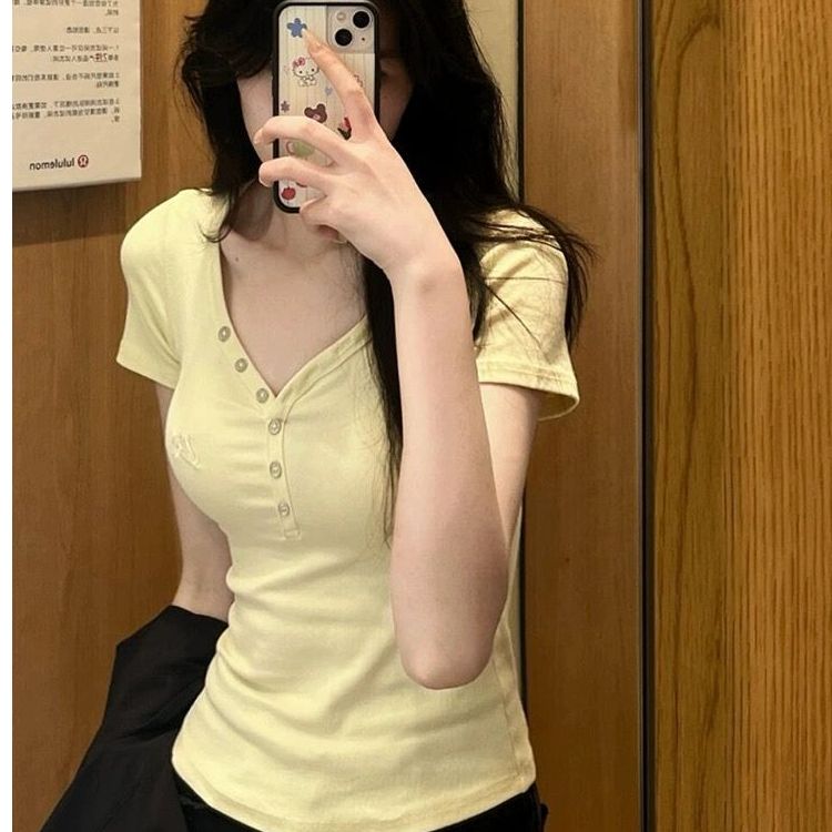 v领正肩短袖修身纽扣美式辣妹上衣
