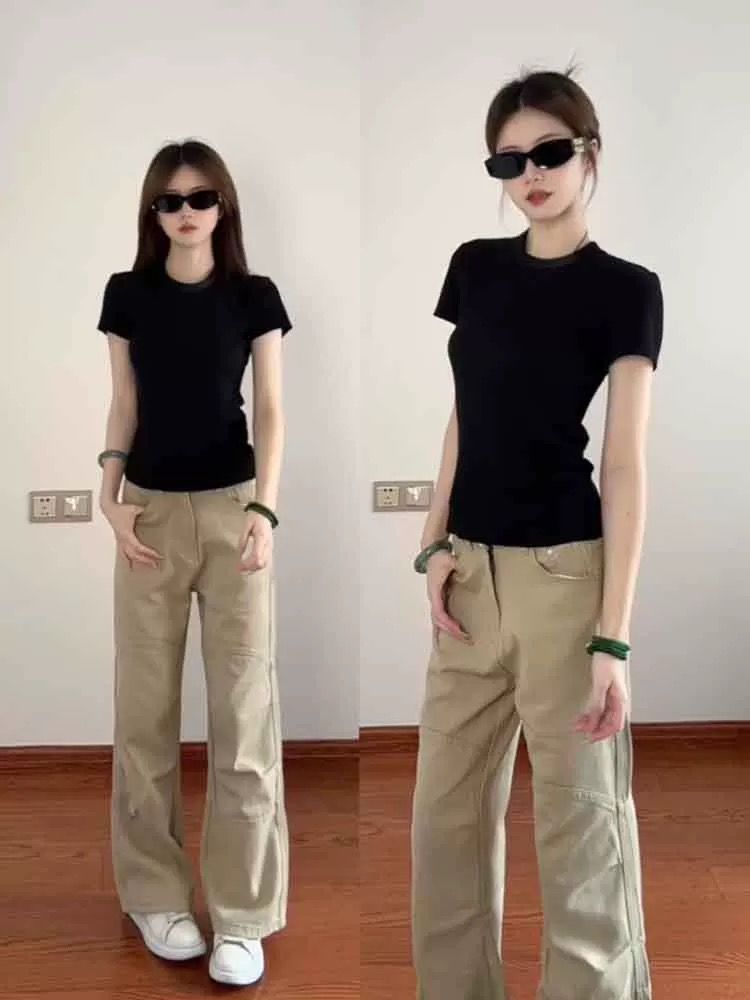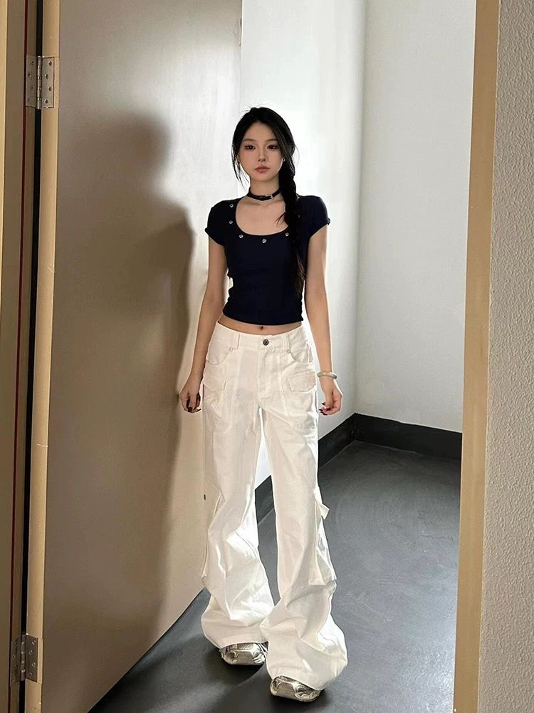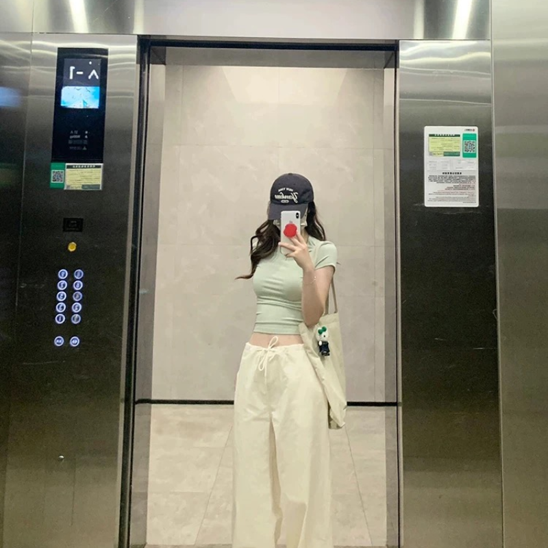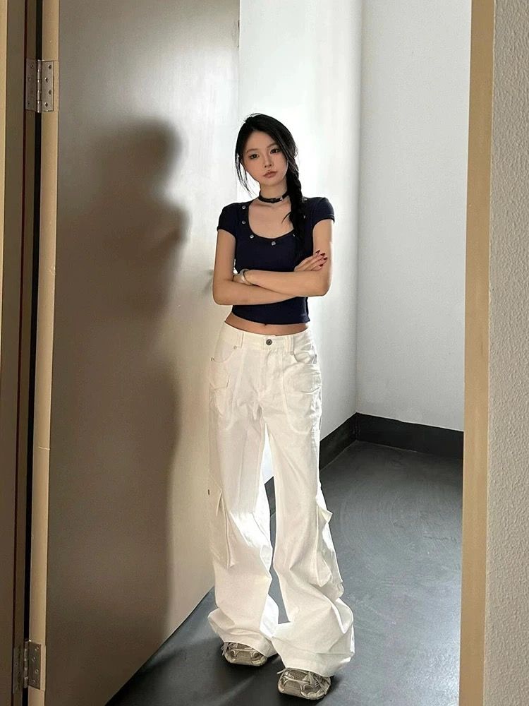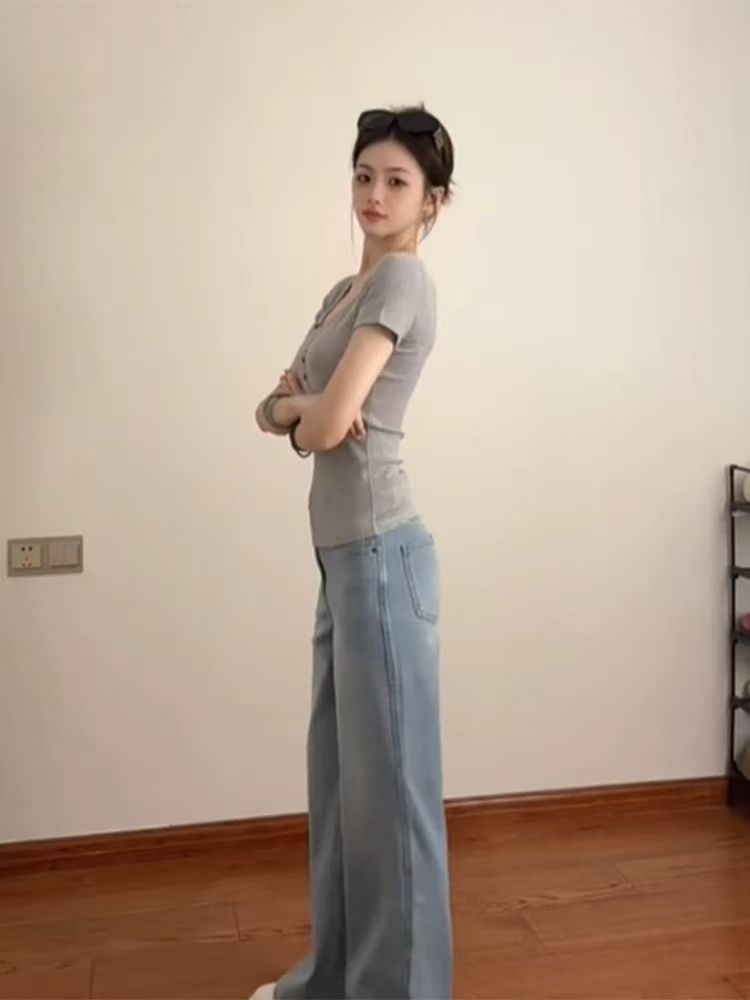 v领正肩短袖修身纽扣美式辣妹上衣