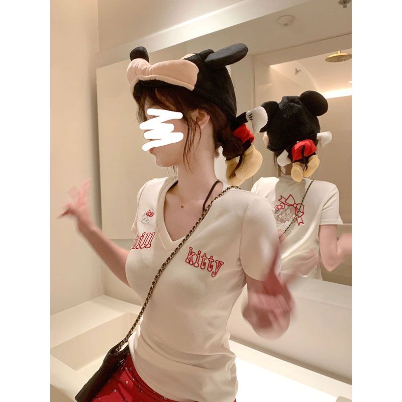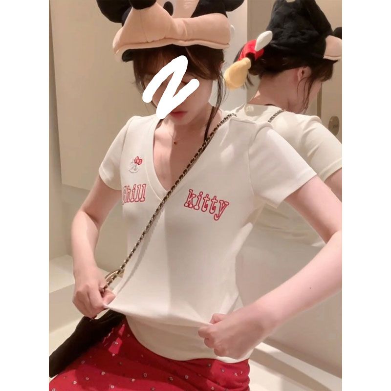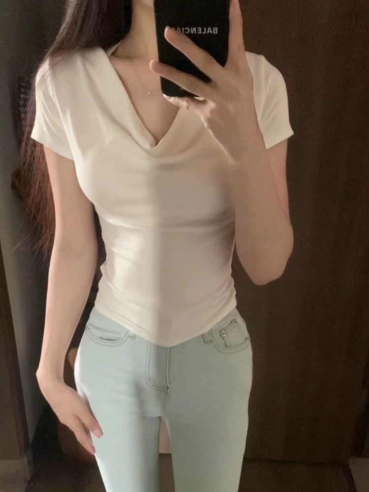 韩系温柔v领短袖t恤夏季设计感小众甜辣短款上衣女