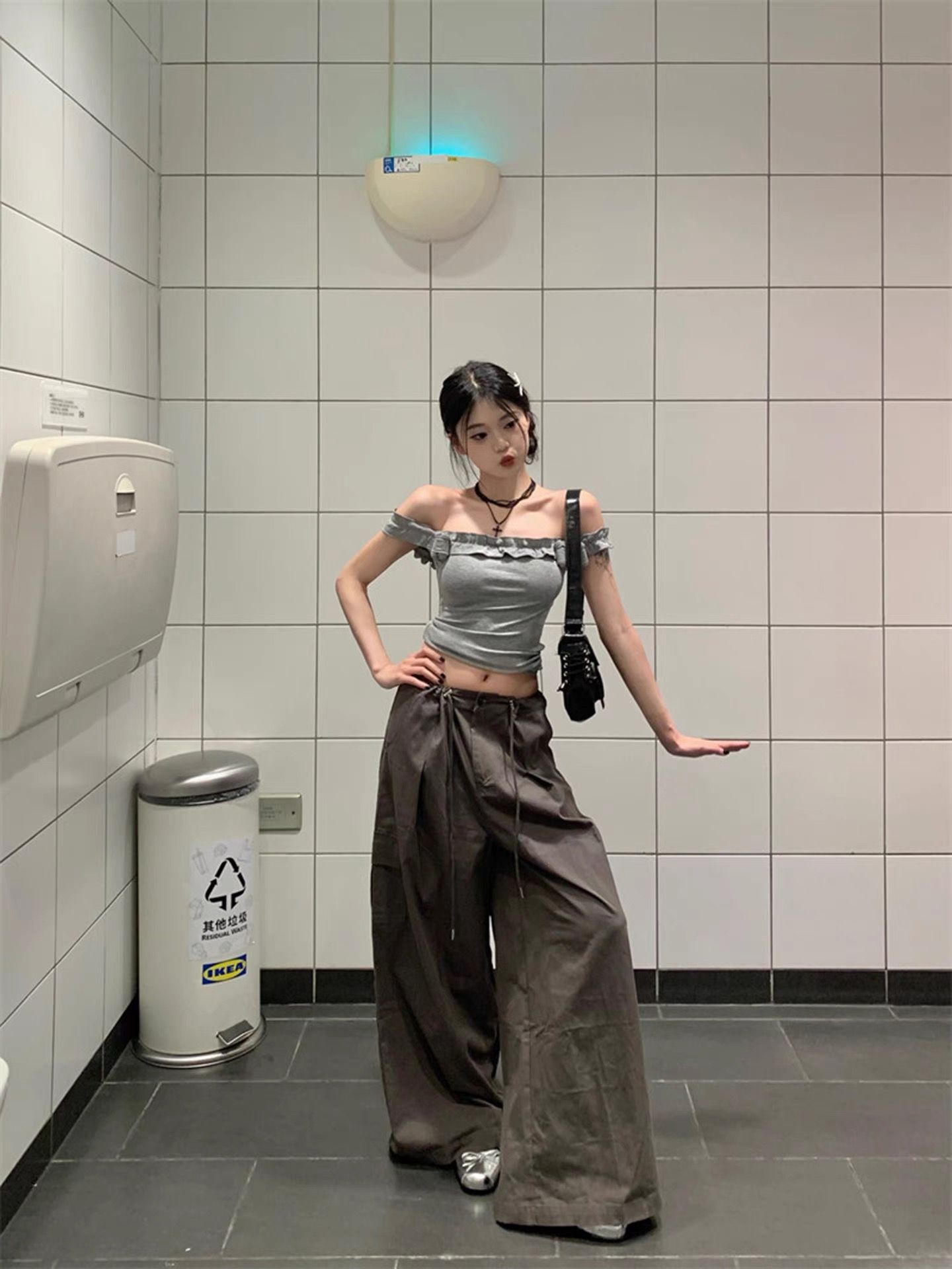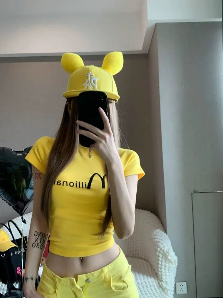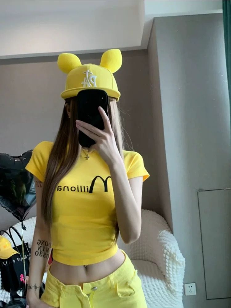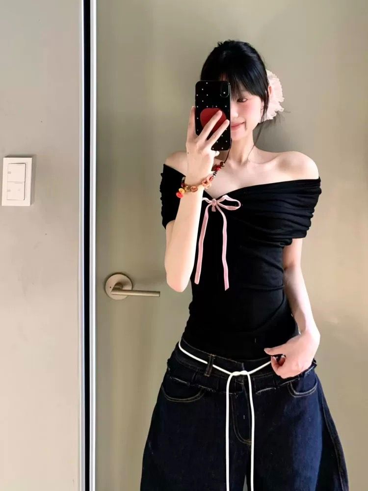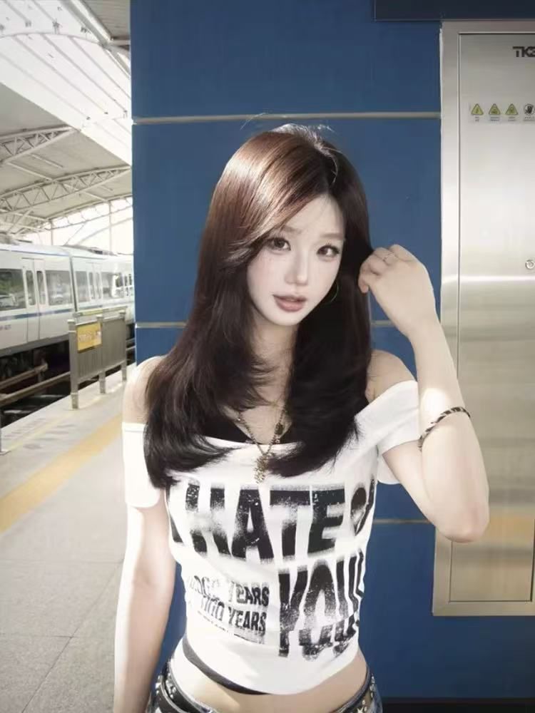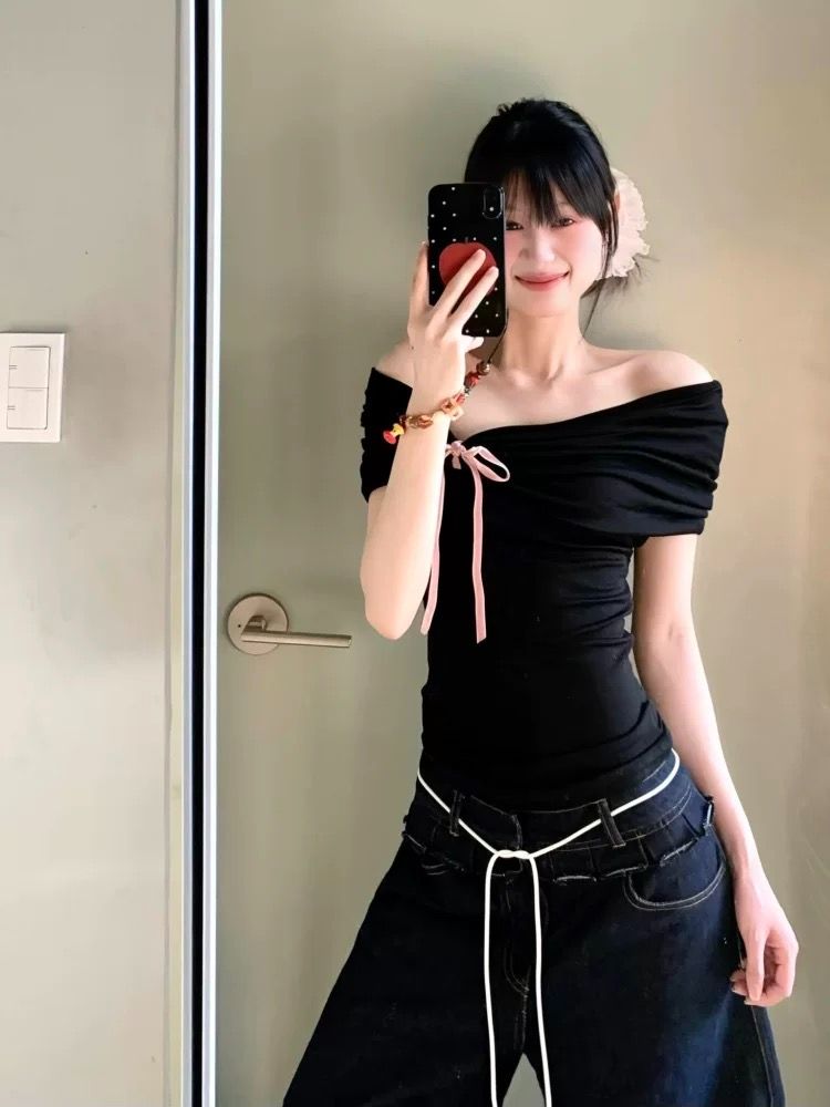 美式辣妹字母印花斜肩短袖T恤夏季收腰露肩上衣女
