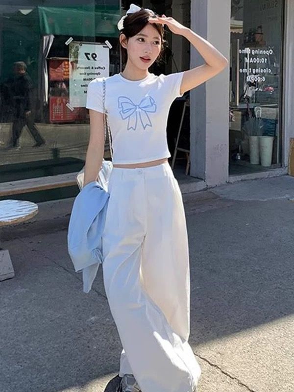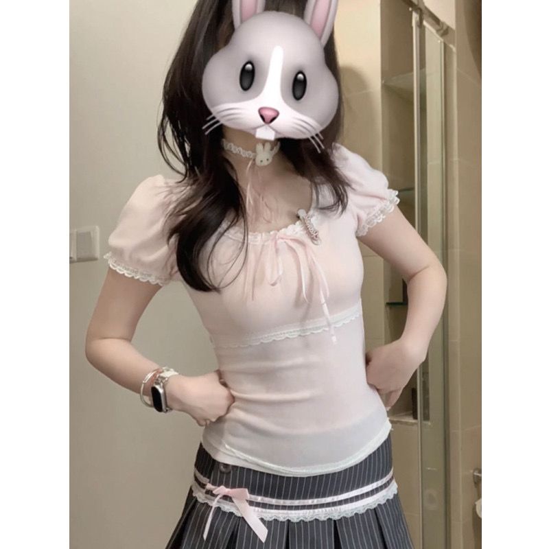 蕾丝花边蝴蝶结短袖t恤女