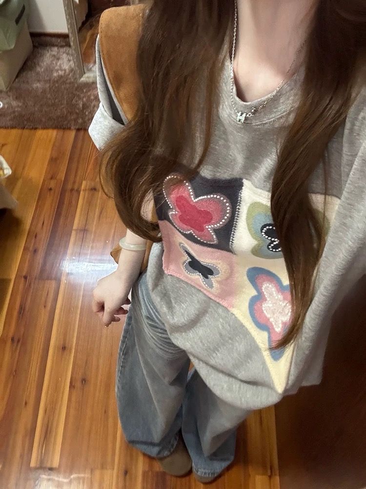 T恤宽松短袖,原版 毛衣贴块加印花 上衣