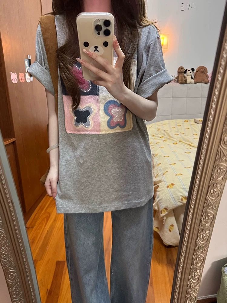 宽松版 刺绣 T恤上衣短袖