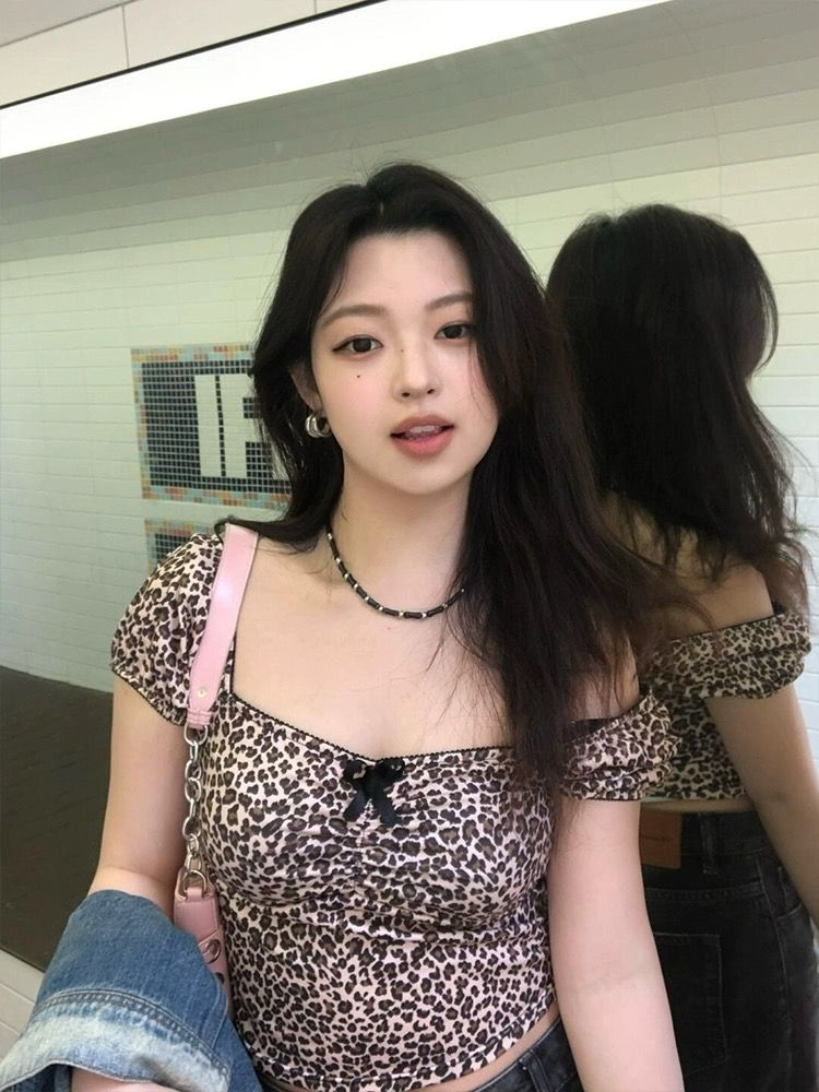 豹纹短袖露背显瘦性感一字领紧身上衣