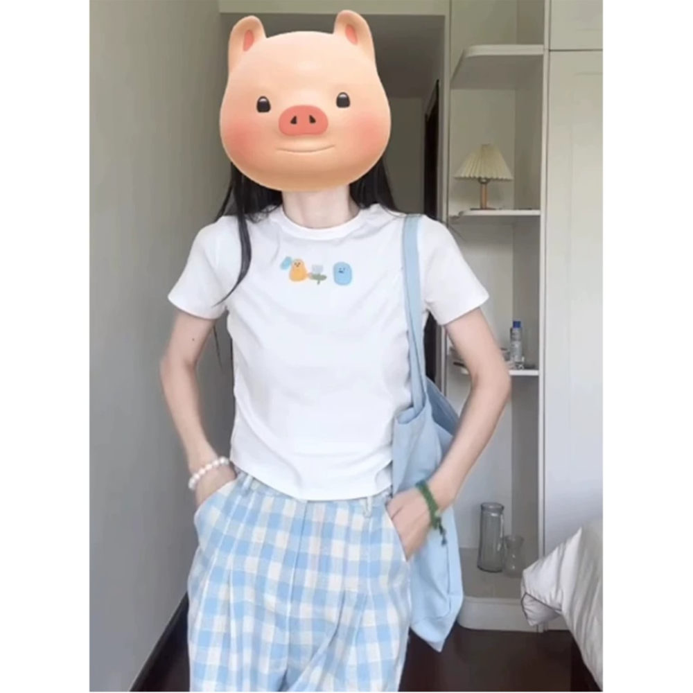 格子纹正肩短袖短款上衣