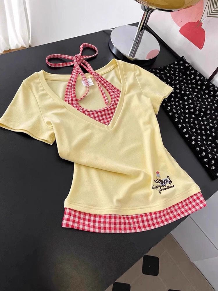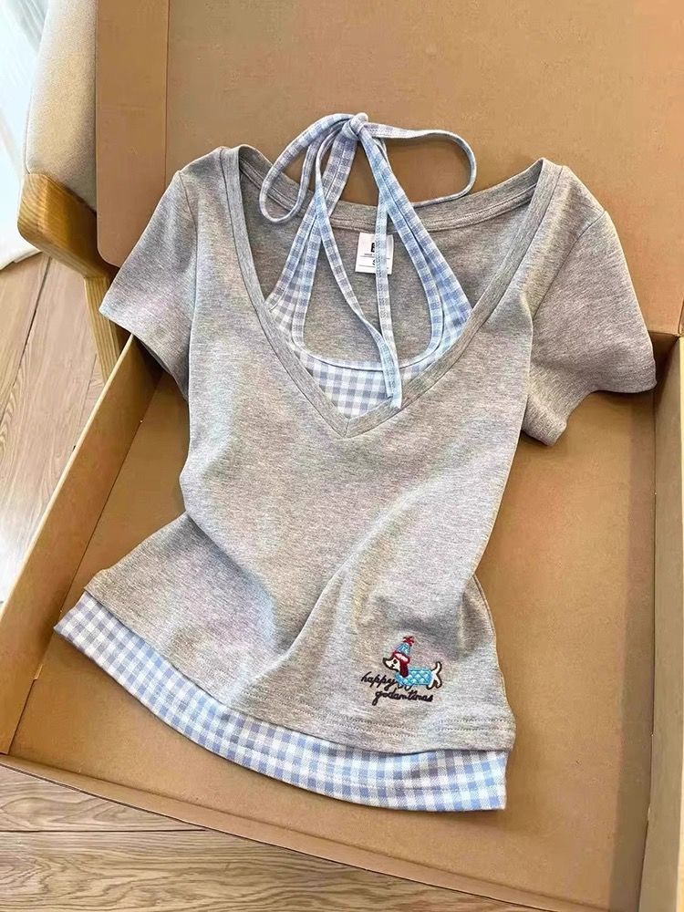 温柔甜妹风设计感蕾丝拼接短袖T恤女辣妹上衣