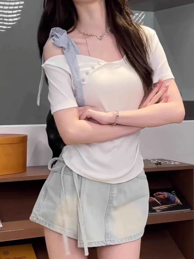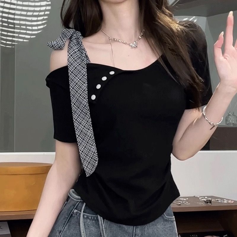夏季辣妹显瘦正肩短袖t恤不规则Polo衫